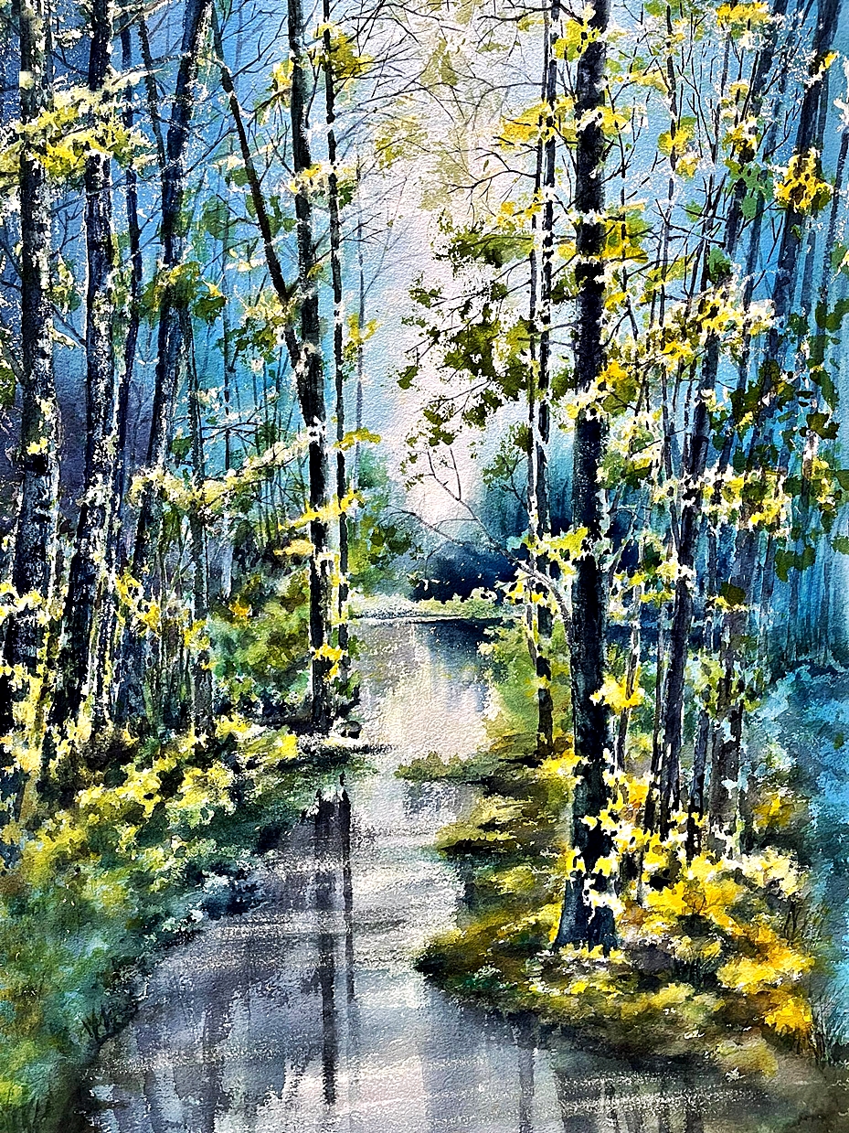 这清澈的溪水缓缓穿流于一片悠悠的静谧树林间,那潺潺流水声令人悄然忘却世间的喧哗与烦扰,怡然感同身处仙境。那由绿转黄的片片叶子悄悄告诉我们寒秋已开始逐渐弥漫林木间,篇篇的秋诗吟诵赞美道此时此景黄胜于绿,它让场景无限绮丽、深深扣人心弦、令人向往不已而陶醉万分!