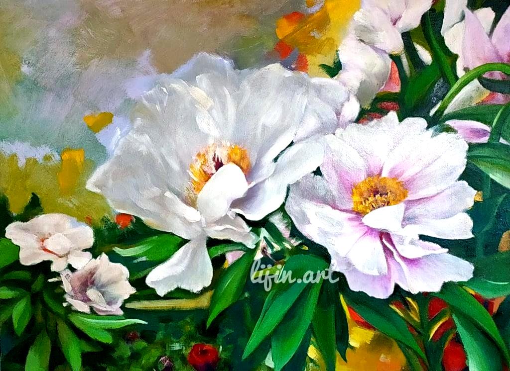 Dedicated artist Teo Lay Hua is not exceptional too, she not only painted out the beautiful appearance of the white peony but also integrated a deeper level of characteristic elements of the white peony into her exquisite art piece. This can be described as "any good painting cannot be perfect without the sensational essential of the subject."