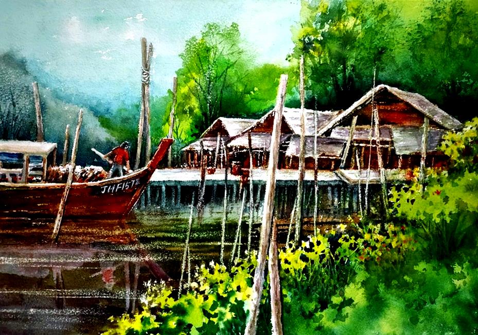 This scenically image of diminishing serenity of typical Malaysian fishing village brilliantly painted in vibrant watercolour is an exquisitely outstanding work of art by Teo Lay Hua.